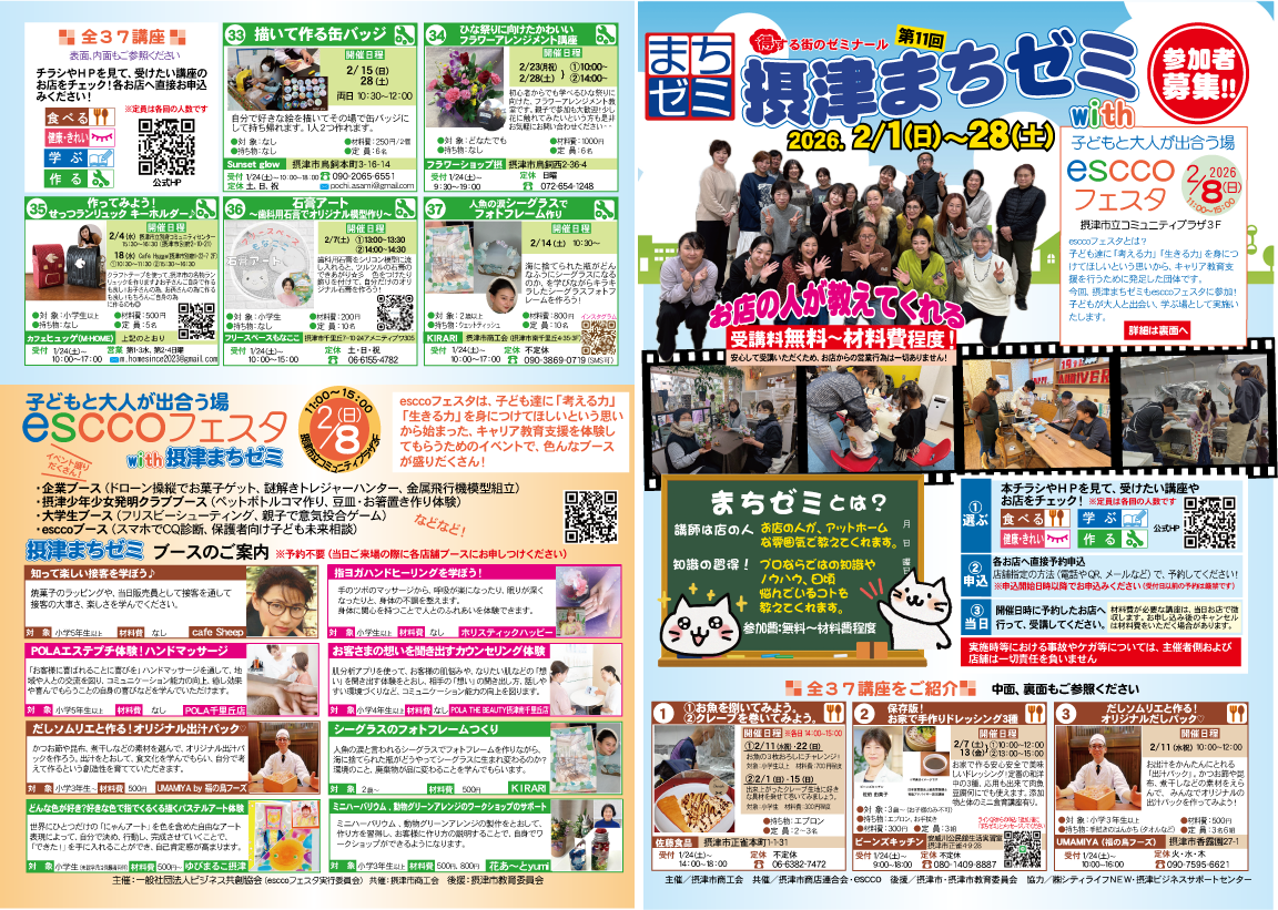| 開催概要 | 摂津まちゼミ 第11回 2026年2月1日(日)~2月28日(土) 予約:1/24以降、月各店舗に電話やQRコードなどから直接申込 場所:摂津市内各店舗等 ※荒天や疫病など、状況により中止になる場合があります。 |